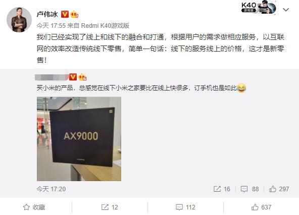 最新資訊:5 月 30 日消息,有網友通過微博發文稱:" 買小米的產品,總感覺在線下小米之家要比在線上快很多,訂手機也是如此",對此,小米集團合伙人、中國區、國際部總裁、Redmi 品牌總經理盧偉冰表示,小米已經實現了線上和線下的融合和打通,根據用戶的需求做相應服務,以互聯網的效率改造傳統線下零售。